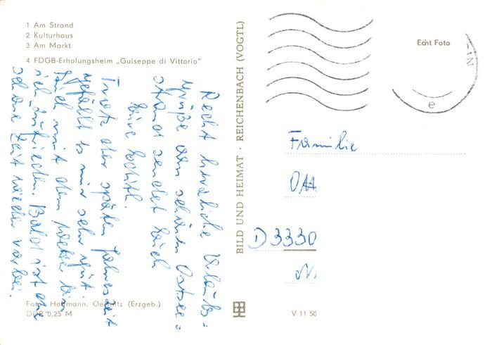 73924683 alte Postkarte Heringsdorf Ostseebad Usedom Strand Kulturhaus Am Markt FDGB Erholungsheim Guiseppe di Vittorio postalisch gelaufen Erhaltung siehe scans [FriedD77] KatCode: 11110013059112