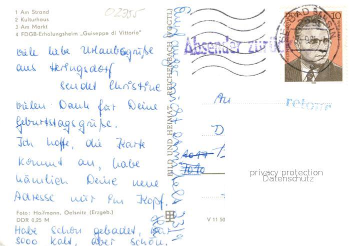 72937418 alte Postkarte Heringsdorf Ostseebad Usedom Strand Kulturhaus Markt FDGB Erholungsheim Guiseppe di Vittorio postalisch gelaufen Erhaltung siehe scans [FriedD77] KatCode: 11110013059112