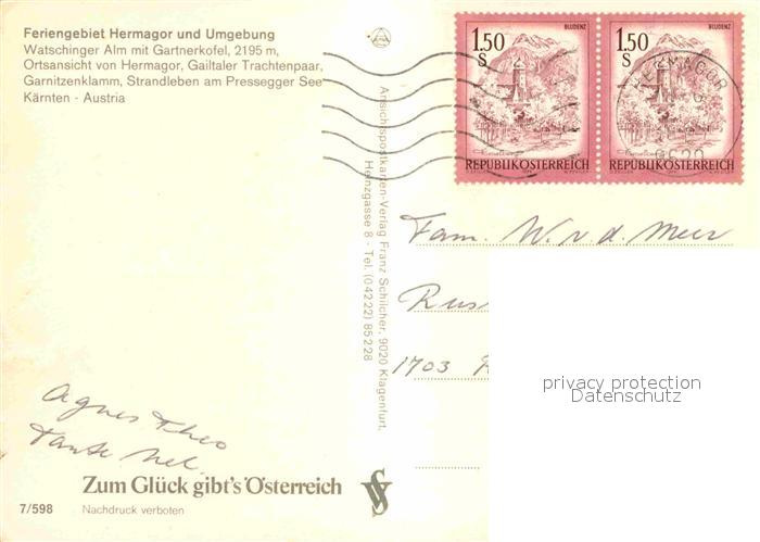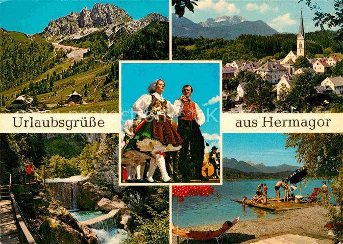 72867545 alte Postkarte Hermagor Kaernten Watschinger Alm mit Gartnerkofel Ortsblick Gailtaler Trachtenpaar Garnitzenklamm Strand am Pressegger See postalisch gelaufen Erhaltung siehe scans [WerneD78] KatCode: 11390212020305