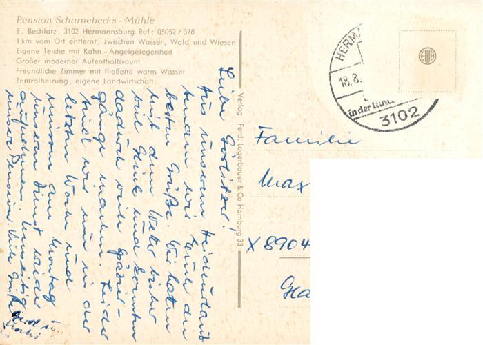 73880705 alte Postkarte Hermannsburg Pension Scharnebecksmuehle Gastraum Partie am Wasser Bootfahren postalisch gelaufen Erhaltung siehe scans [FriedD77] KatCode: 11110003351013