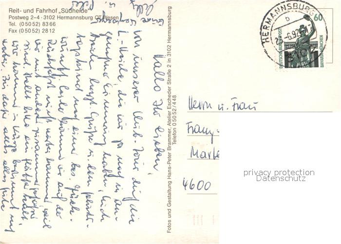 73671266 alte Postkarte Hermannsburg Reit und Fahrhof Suedheide Teilansichten Pferdegespann postalisch gelaufen Erhaltung siehe scans [WerneD78] KatCode: 11110003351013
