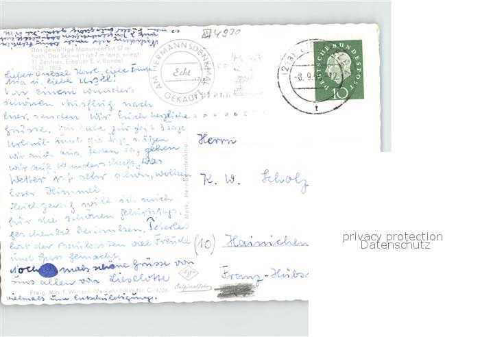 72390036 alte Postkarte Hermannsdenkmal Fliegeraufnahme Teutoburger Wald postalisch gelaufen Erhaltung siehe scans KatCode: 11110005766020