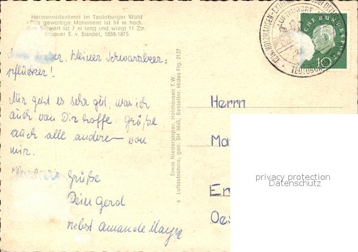 72403461 alte Postkarte Hermannsdenkmal Teutoburger Wald Fliegeraufnahme postalisch gelaufen Erhaltung siehe scans KatCode: 11110005766020