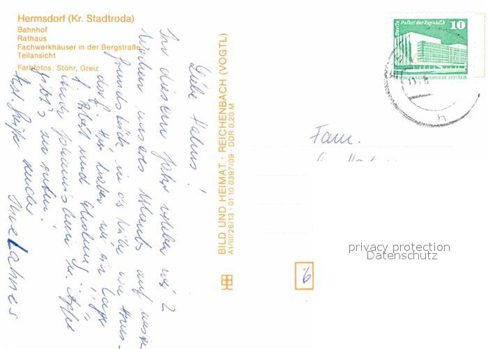 72628483 alte Postkarte Hermsdorf Thueringen Bahnhof Rathaus Fachwerkhaeuser Bergstrasse Teilansicht postalisch gelaufen Erhaltung siehe scans [WerneD78] KatCode: 11110016074041