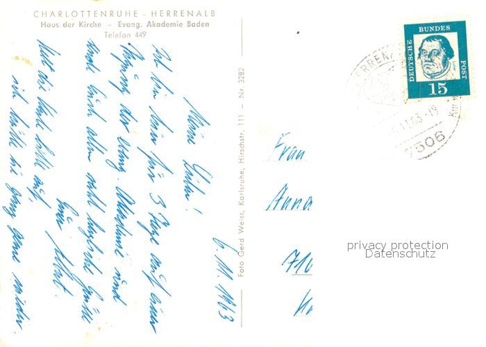 33699659 alte Postkarte Herrenalb Bad Herrenalb Charlottenruhe Herrenalb Haus der Kirche Ev Akademie Baden postalisch gelaufen Erhaltung siehe scans [WerneD78] KatCode: 11110008235033