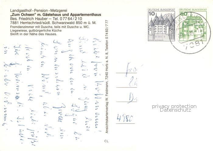 73641097 alte Postkarte Herrischried Landgasthof Pension Zum Ochsen Gaestehaus Appartementhaus Hallenbad Fliegeraufnahme postalisch gelaufen Erhaltung siehe scans [WerneD78] KatCode: 11110008337049