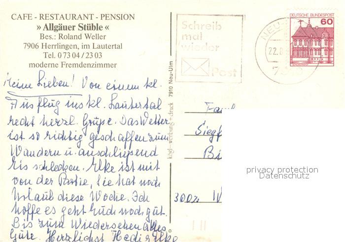 73636858 alte Postkarte Herrlingen Cafe Restaurant Pension Allgaeuer Stueble im Lautertal postalisch gelaufen Erhaltung siehe scans [FriedD77] KatCode: 11110008425141
