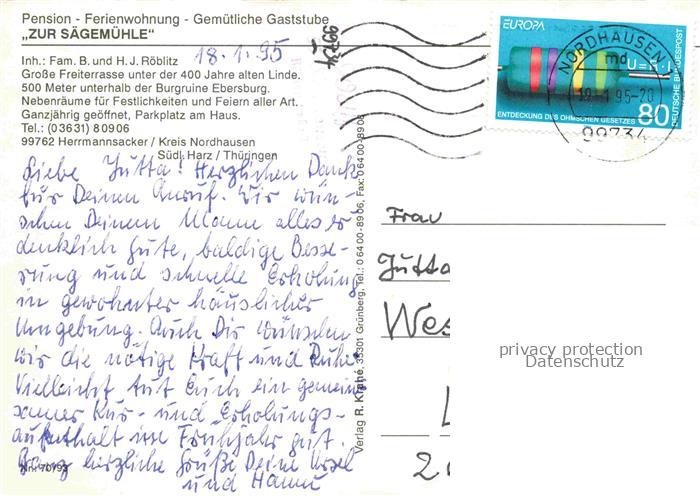 74028373 alte Postkarte Herrmannsacker Gasthaus Pension zur Saegemuehle Gaststube Burgruine Ebersburg postalisch gelaufen Erhaltung siehe scans [FriedD77] KatCode: 11110016062018