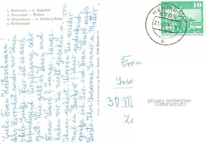 72712060 alte Postkarte Herrnhut Gedenkstein Vogtshof Zinzendorf Graeber Witwenhaus Hutberg Altan Kirchensaal postalisch gelaufen Erhaltung siehe scans [FriedD77] KatCode: 11110014286160