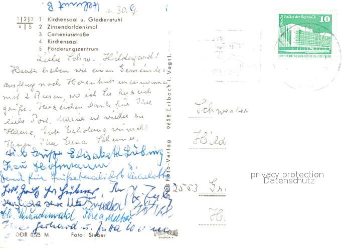 73549871 alte Postkarte Herrnhut Kirchensaal Glockenstuhl Zinzendorfdenkmal Comenisusstrasse Foerderungszentrum postalisch gelaufen Erhaltung siehe scans [WerneD78] KatCode: 11110014286160