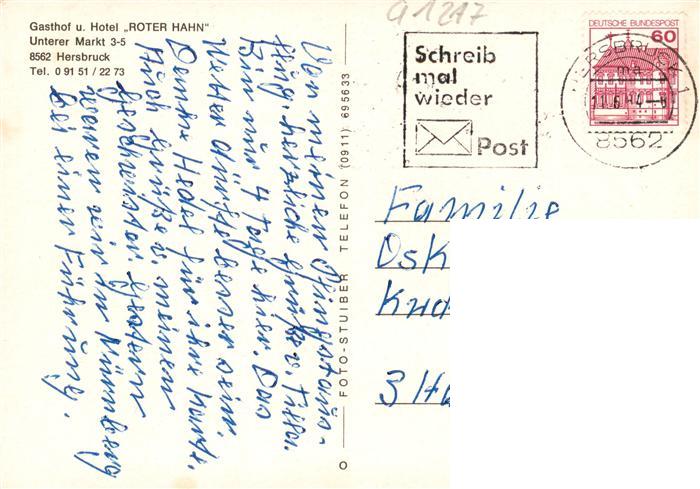 73884521 Hersbruck Bayern Gasthof Hotel Roter Hahn Rezeption Zimmer postalisch gelaufen Erhaltung siehe scans [WerneD78] alte Postkarte Wern Katcode 11110009574132