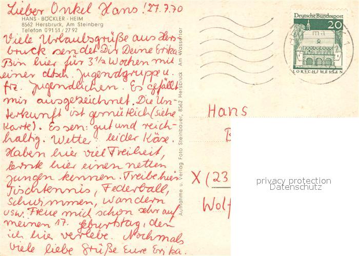 73659734 Hersbruck Bayern Hans Boeckler Heim postalisch gelaufen Erhaltung siehe scans [FriedD77] alte Postkarte Frie Katcode 11110009574132
