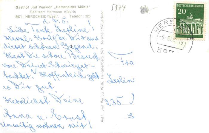 73972077 alte Postkarte Herscheid Sauerland NRW Gasthof Pension Herscheider Muehle postalisch gelaufen Erhaltung siehe scans [FriedD77] KatCode: 11110005962020
