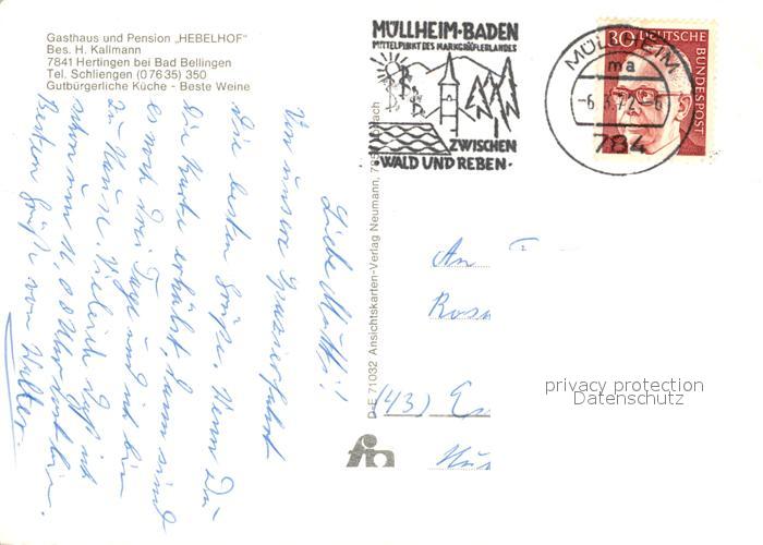 73105032 alte Postkarte Hertingen Bad Bellingen Gasthaus Pension Hebelhof postalisch gelaufen Erhaltung siehe scans [KathaD81] KatCode: 11110008336006