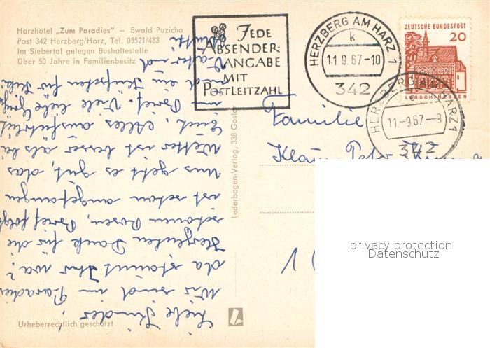 73770044 alte Postkarte Herzberg Harz Harzhotel Zum Paradies Gastraum Panorama postalisch gelaufen Erhaltung siehe scans [WerneD78] KatCode: 11110003156009