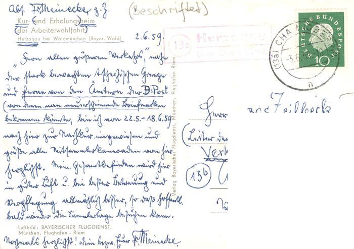73970987 alte Postkarte Herzogau Waldmuenchen Kur- und Erholungsheim der AWO postalisch gelaufen Fliegeraufnahme Erhaltung siehe scans [FriedD77] KatCode: 11110009372171