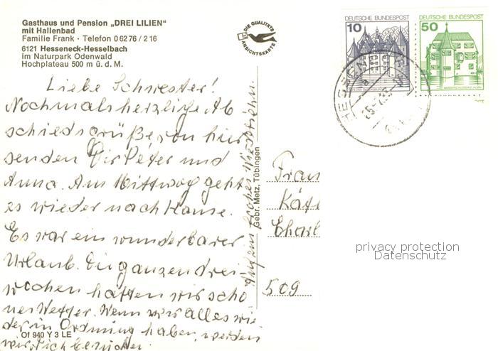 73759091 alte Postkarte Hesseneck Fliegeraufnahme Gasthaus Pension Drei Lilien mit Hallenbad Wildpark Panorama postalisch gelaufen Erhaltung siehe scans [WerneD78] KatCode: 11110006437008