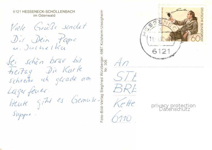 72797119 alte Postkarte Hesseneck Schoellenbach Seepartie Bruecke postalisch gelaufen Erhaltung siehe scans [LiesaD40] KatCode: 11110006437008