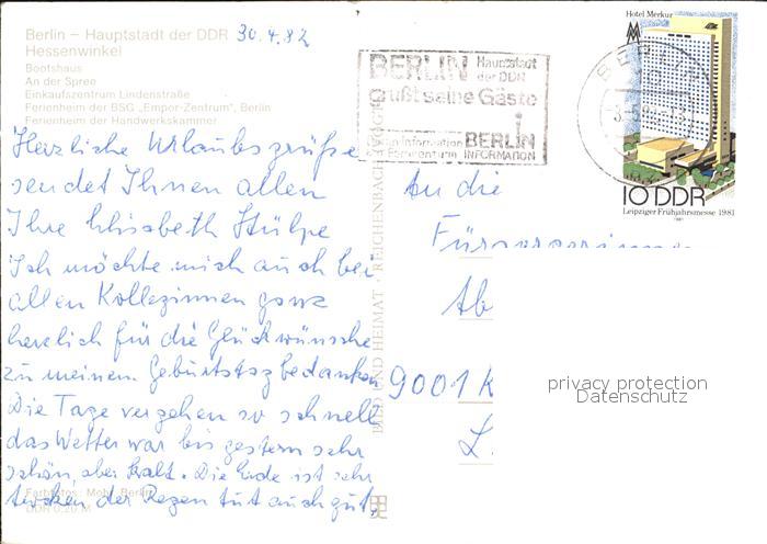 72418378 alte Postkarte Hessenwinkel Berlin Boothaus An der Spree Einkaufszentrum Lindenstrasse Ferienheime der BSG Berlin und der Handwerkskammer postalisch gelaufen Erhaltung siehe scans KatCode: 11110011000000