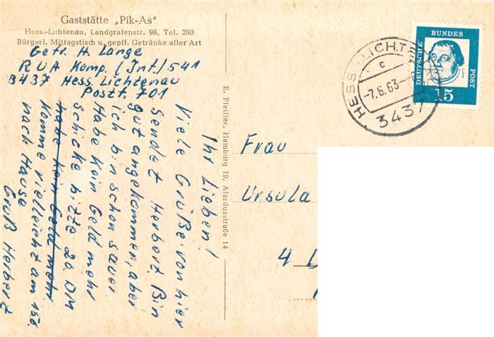 73873767 alte Postkarte Hessisch-Lichtenau Gaststaette Pik-As Gastraeume postalisch gelaufen Erhaltung siehe scans [FriedD77] KatCode: 11110006636006