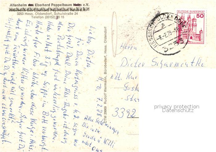 73086709 alte Postkarte Hessisch Oldendorf Altenheim Eberhard Poppelbaum postalisch gelaufen Erhaltung siehe scans [NatalD47] KatCode: 11110003252007