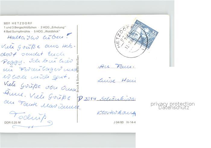 71900208 alte Postkarte Hetzdorf Halsbruecke Bergschloesschen HOG Erholung Bad-Sumpfmuehle HOG Waldblick postalisch gelaufen Erhaltung siehe scans KatCode: 11110014177210
