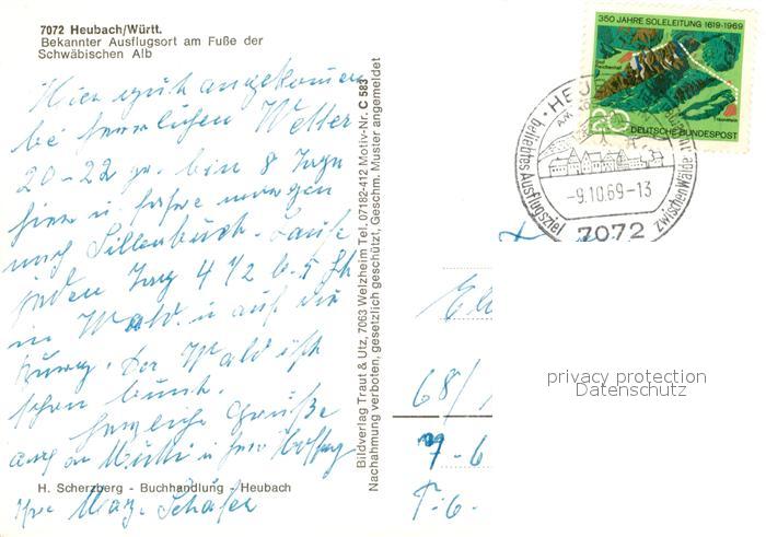 73176507 alte Postkarte Heubach Wuerttemberg St Ulrichskirche Blockturm Ruine Rosenstein Fernsehturm Rathaus Chronik Wappen postalisch gelaufen Erhaltung siehe scans [FriedD77] KatCode: 11110008136028
