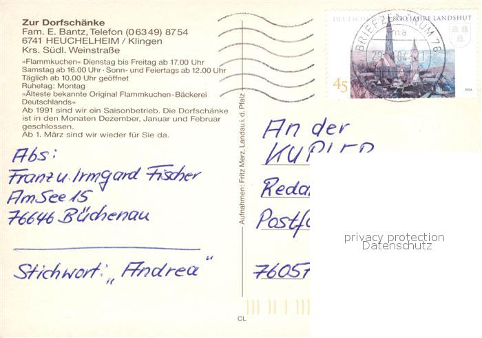 72958405 alte Postkarte Heuchelheim-Klingen Zur Dorfschaenke postalisch gelaufen Erhaltung siehe scans [NatalD47] KatCode: 11110007337040