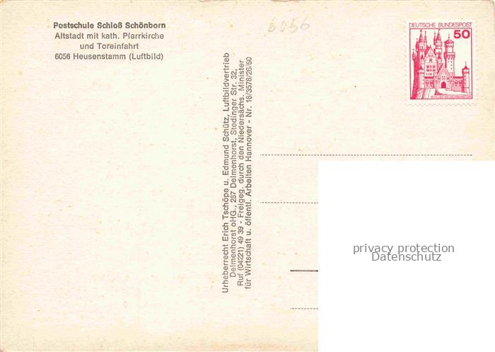74044768 alte Postkarte Heusenstamm Postschule Schloss Schoenborn Altstadt mit kath Pfarrkirche und Toreinfahrt Fliegeraufnahmen postalisch gelaufen Erhaltung siehe scans [WerneD78] KatCode: 11110006438005