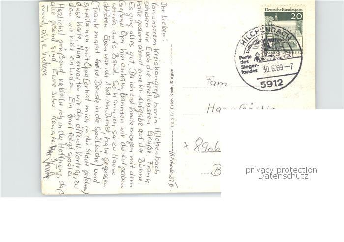 72613307 alte Postkarte Hilchenbach Evangelische Kirche Breitenbach Talsperre Marktplatz Blick vom Herrenberg postalisch gelaufen Erhaltung siehe scans [AndreD76] KatCode: 11110005970020