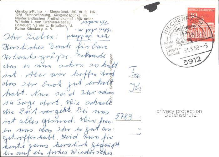 72174954 alte Postkarte Hilchenbach Ginsburg Ruine postalisch gelaufen Erhaltung siehe scans KatCode: 11110005970020