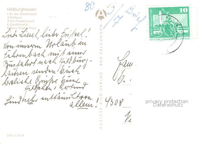 73014763 alte Postkarte Hildburghausen An der Stadtmauer Rathaus Am Friedenspark Stadttheater Marx Engels Platz postalisch gelaufen Erhaltung siehe scans [WerneD78] KatCode: 11110016069024