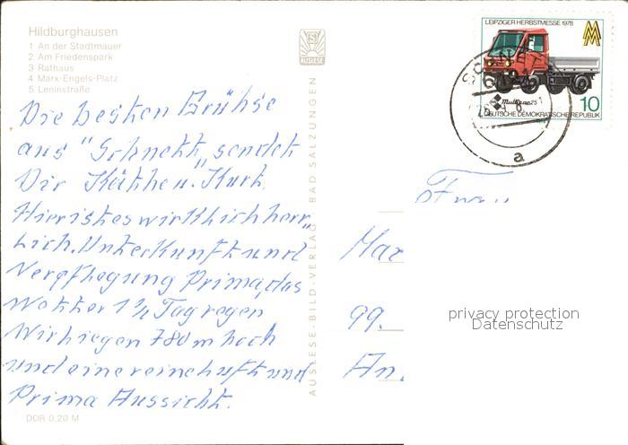 72543084 alte Postkarte Hildburghausen Stadtmauer Friedenspark Rathaus Marx Engels Platz Leninstrasse postalisch gelaufen Erhaltung siehe scans [KathaD75 kv015box] KatCode: 11110016069024