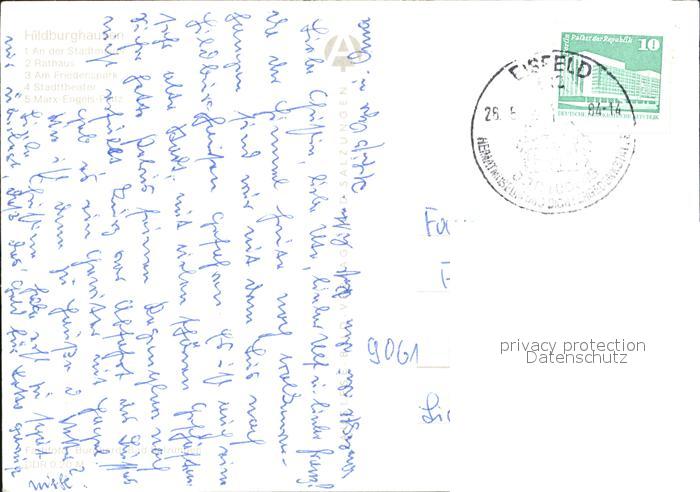 72418400 alte Postkarte Hildburghausen Stadtmauer Rathaus Friedenspark Stadttheater Marx Engels Platz postalisch gelaufen Erhaltung siehe scans KatCode: 11110016069024