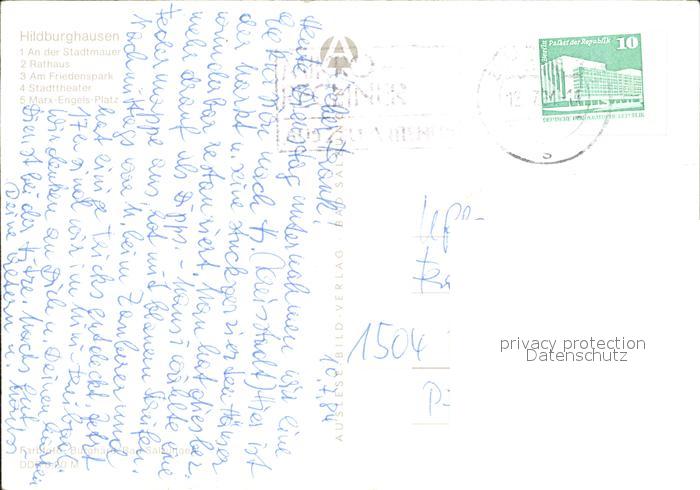 72352738 alte Postkarte Hildburghausen Stadtmauer Rathaus Friedenspark Stadttheater Marx Engels Platz postalisch gelaufen Erhaltung siehe scans KatCode: 11110016069024
