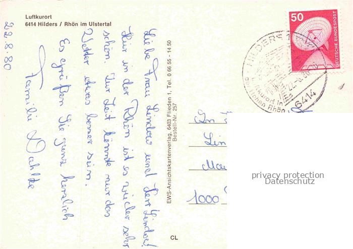 74138819 alte Postkarte Hilders Rhoen Kirche Schwimmbad Rhoen Hotel Kirch und Marktstrasse Marienstatue Gemeindezentrum postalisch gelaufen Erhaltung siehe scans [FriedD77] KatCode: 11110006631012