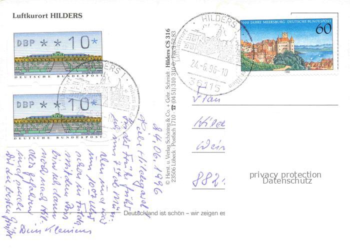 74157655 alte Postkarte Hilders Rhoen Kirchturm Altstadt Dachlandschaft Felder Wald Rhoen Berge postalisch gelaufen Fliegeraufnahme Erhaltung siehe scans [Karloger] KatCode: 11110006631012