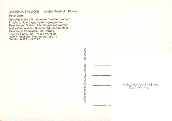 72724867 HILDESHEIM CITY Gaestehaus Klocke Hotel Garni postalisch nicht gelaufen Erhaltung siehe scans [FriedD77] KatCode: 11110003254021