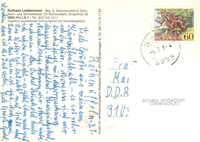 73660618 alte Postkarte Hille Nordrhein-Westfalen Kurhaus Lindenmoor Moor- und Schwefelbad Restaurant Hallenbad postalisch gelaufen Erhaltung siehe scans [FriedD77] KatCode: 11110005770012