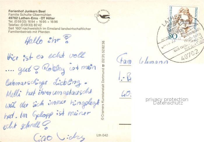 73686937 alte Postkarte Hilter Ems Ferienhof Junkern Beel Bibersee Pferdezucht Reitwege Lagerfeuer Treck Hilter Berge postalisch gelaufen Erhaltung siehe scans [FriedD77] KatCode: 11110003454029