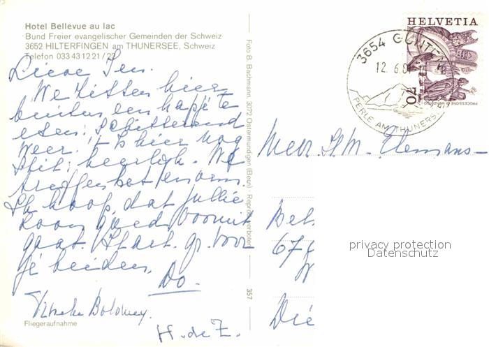 12659768 alte Postkarte Hilterfingen Thunersee Hotel Bellevue postalisch gelaufen Erhaltung siehe scans [AndreD76] KatCode: 11470060240764
