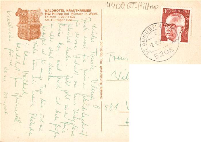 73913360 Hiltrup Muenster Westfalen Waldhotel Krautkraemer Eingangstor postalisch gelaufen Erhaltung siehe scans [FriedD77] alte Postkarte Frie Katcode 11110005515000