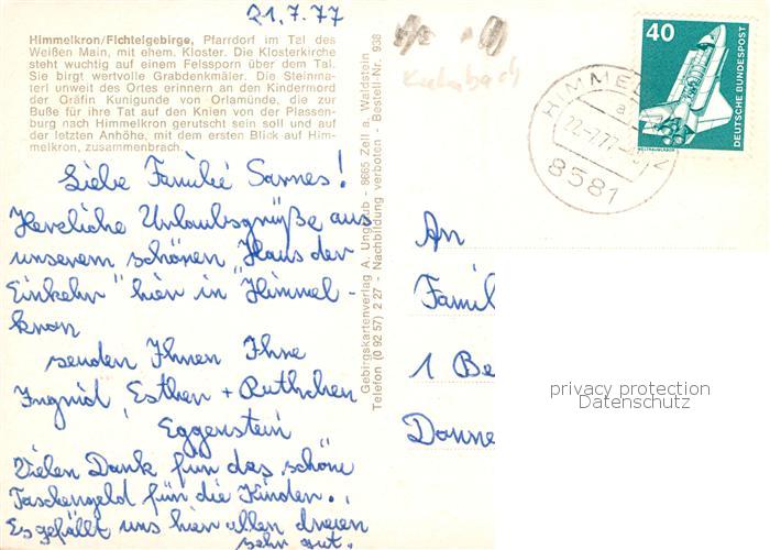73840049 alte Postkarte Himmelkron Panorama Mainbruecke mit Stiftskirche Freibad Marteristein der Graefin von Orlamuende postalisch gelaufen Erhaltung siehe scans [FriedD77] KatCode: 11110009477121
