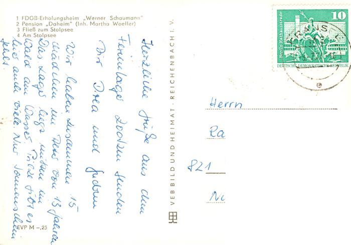 73893631 alte Postkarte Himmelpfort FDGB Erholungsheim Werner Schaumann Pension Daheim Fliess zum Stolpsee Am Stolpsee postalisch gelaufen Erhaltung siehe scans [FriedD77] KatCode: 11110012065084
