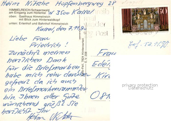73643090 alte Postkarte Himmelreich Hoellsteig Gasthaus Himmelreich mit Blick zum Hinterwaldkopf Schwarzwald Erlenhof Kuehe Bahnhof postalisch gelaufen Erhaltung siehe scans [FriedD77] KatCode: 11110008315052