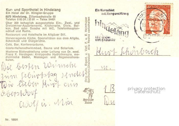 72969700 alte Postkarte Hindelang Bad Kur- und Sporthotel postalisch gelaufen Erhaltung siehe scans [LiesaD40] KatCode: 11110009780123