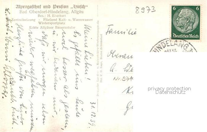 42963097 alte Postkarte Hindelang Gasthof Pension Hirsch postalisch gelaufen Erhaltung siehe scans [AndreD76] KatCode: 11110009780123