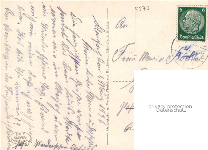 42966249 Hindelang Gasthof Pensionsbesitzer Otto Schneider postalisch gelaufen Erhaltung siehe scans [KathaD81] alte Postkarte Kath Katcode 11110009780123