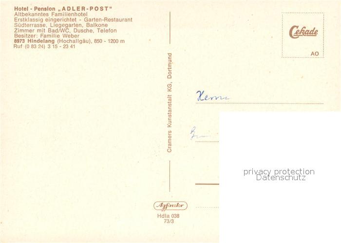 73660586 Hindelang Hotel Adler Post im Winter postalisch nicht gelaufen Erhaltung siehe scans [FriedD77] KatCode: 11110009780123