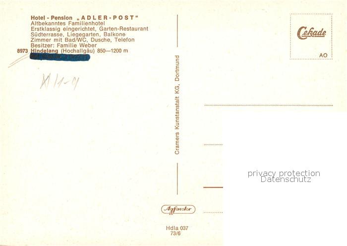 73169504 Hindelang Hotel Pension Adler Post Restaurant Tuerschild postalisch nicht gelaufen Erhaltung siehe scans [FriedD77] KatCode: 11110009780123